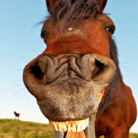 an outdoor surface and is making a funny or playful expression, possibly opening its mouth wide as if laughing or trying to bite something. The background of the photo includes some open space, which could indicate that this scene takes place in a field or