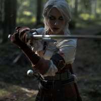the video game "The Witcher 3: Wild Hunt," who is known as Ciri. She is depicted in cosplay, wearing armor and wielding a sword with one hand, ready for action. The setting appears to be a forest or