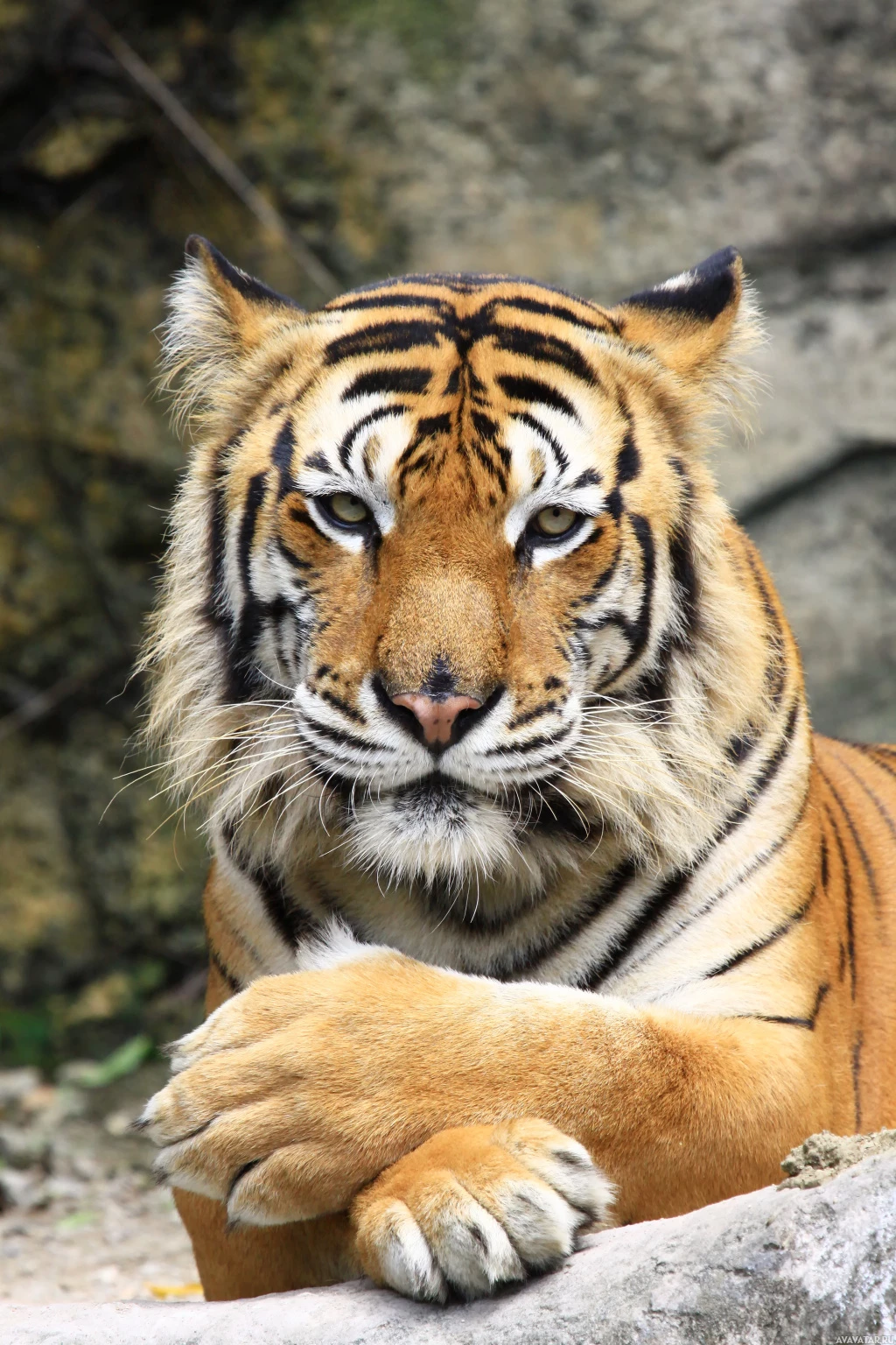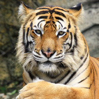 The image shows a tiger, which is an animal known for its distinctive markings and powerful appearance. Tigers are often associated with being the largest living cats and are widely recognized as symbols of strength and courage.