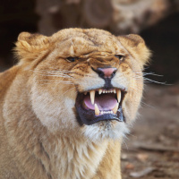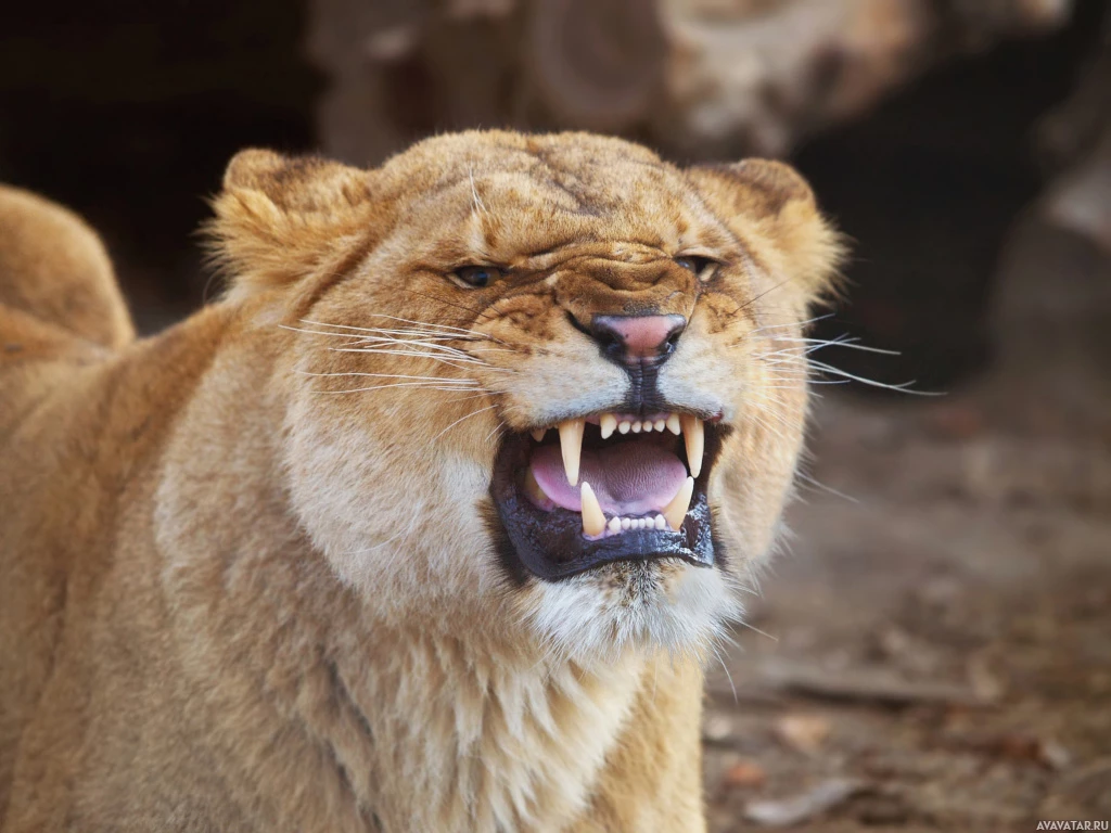 На картинке изображен лев с открытой пастью, который, по-видимому, рычит. Его зубы обнажены, а шерсть вокруг морды взъерошена. Фон позволяет предположить, что эта сцена может происходить в вольере или естественной среде обитания, напоминающей скалистую местность.