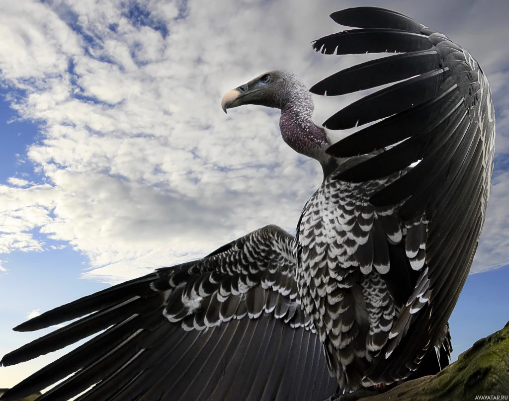 large wingspan and distinctive bald head with feathering on the neck. The background suggests it might be in