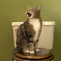На снимке изображена кошка, сидящая на закрытой крышке унитаза. Кажется, что кошка зевает, так как ее рот широко открыт, а глаза полузакрыты или прищурены, что может быть похоже на то, что она кричит или рычит. Фон нейтральный, светло-зеленый.