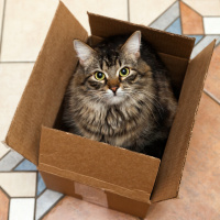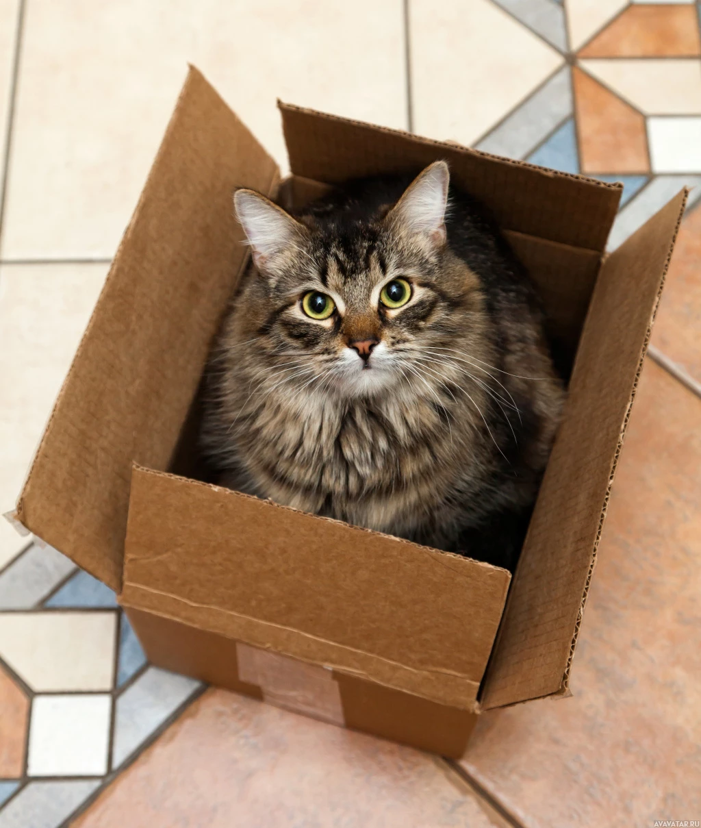На картинке изображен кот, сидящий в картонной коробке. Судя по всему, это домашняя длинношерстная кошка с пушистой шерстью, которая смотрит прямо в камеру.