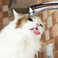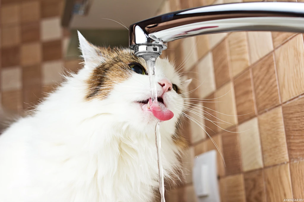 На картинке изображена кошка с открытой пастью, стоящая перед водопроводным краном. Кажется, что кошка взаимодействует с водой, льющейся из крана, возможно, пьет или играет в ней.