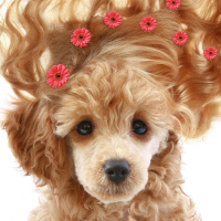 red flowers that resemble pinwheels or possibly poinsettias, adding a playful element to the photo. The background is neutral, which helps the dog stand out as the main subject of the image.