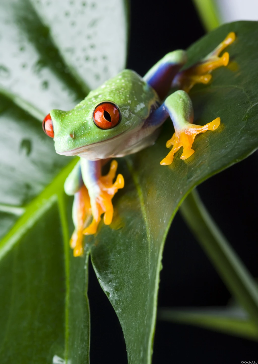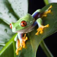 red eyes perched on a leaf. It appears to be resting or observing its surroundings. The frog has distinctive coloration, commonly referred to as "poison dart" pattern due to the resemblance of its skin markings to those found on