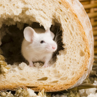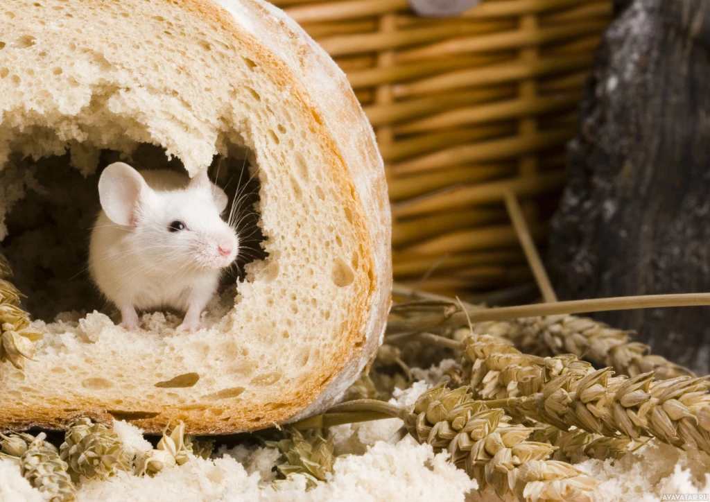 На картинке изображена мышь внутри куска хлеба, который выглядит как батон или булочка. Вокруг него разложены различные продукты, например, что-то похожее на семечки и орехи. Изображение является постановочным для художественного или юмористического эффекта, изображая любопытство мыши к окружающему миру в необычной обстановке.