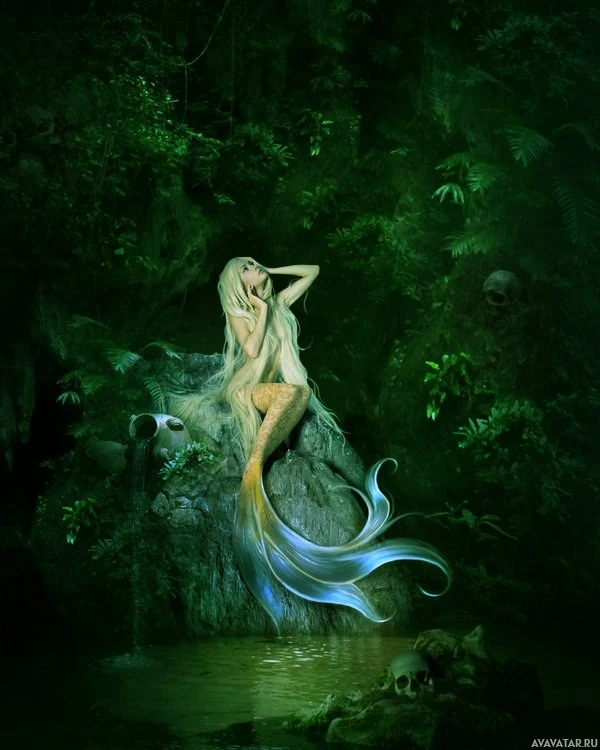 a fantasy scene featuring a mermaid. She is seated on what appears to be a rock or a piece of driftwood, with her long