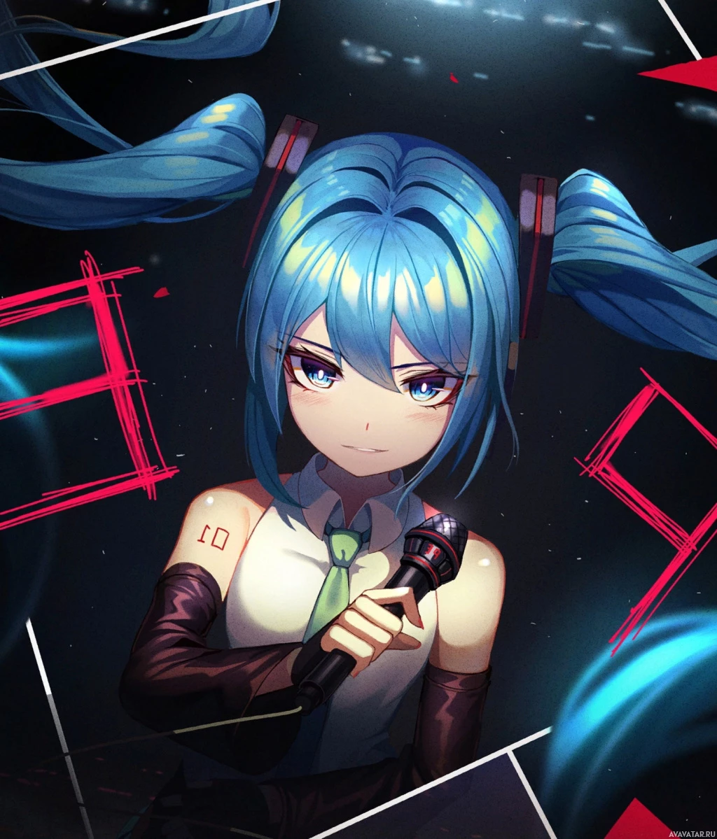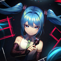 geometric shapes and what appears to be abstract digital elements, contributing to an energetic or futuristic feel. The character's expression is serious and focused, suggesting she may be preparing for a performance or singing.