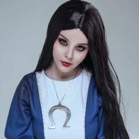 known game. The individual has long dark hair, is wearing a dress with a pattern that matches the iconic attire of Alice from