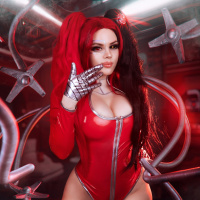 a red bodysuit with metallic details and accessories that resemble parts of machinery or pipes. This character has long