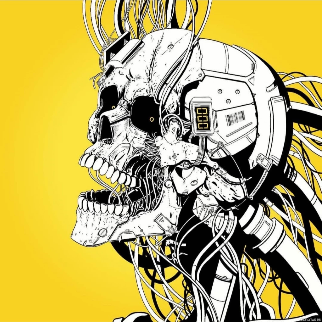 The image depicts a skull with intricate mechanical and electronic components integrated into its structure. Wires are intertwined throughout the skull, suggesting