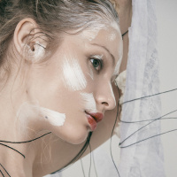 The image shows a young woman with artistic makeup covering her face and neck. She appears to be looking away from the camera, towards something not visible in the frame. Her facial features are emphasized by the white or pale makeup applied with precision. The background is neutral, which puts the focus on her. There are also some textured materials that could be interpreted as fabric or a form of artistic decoration.