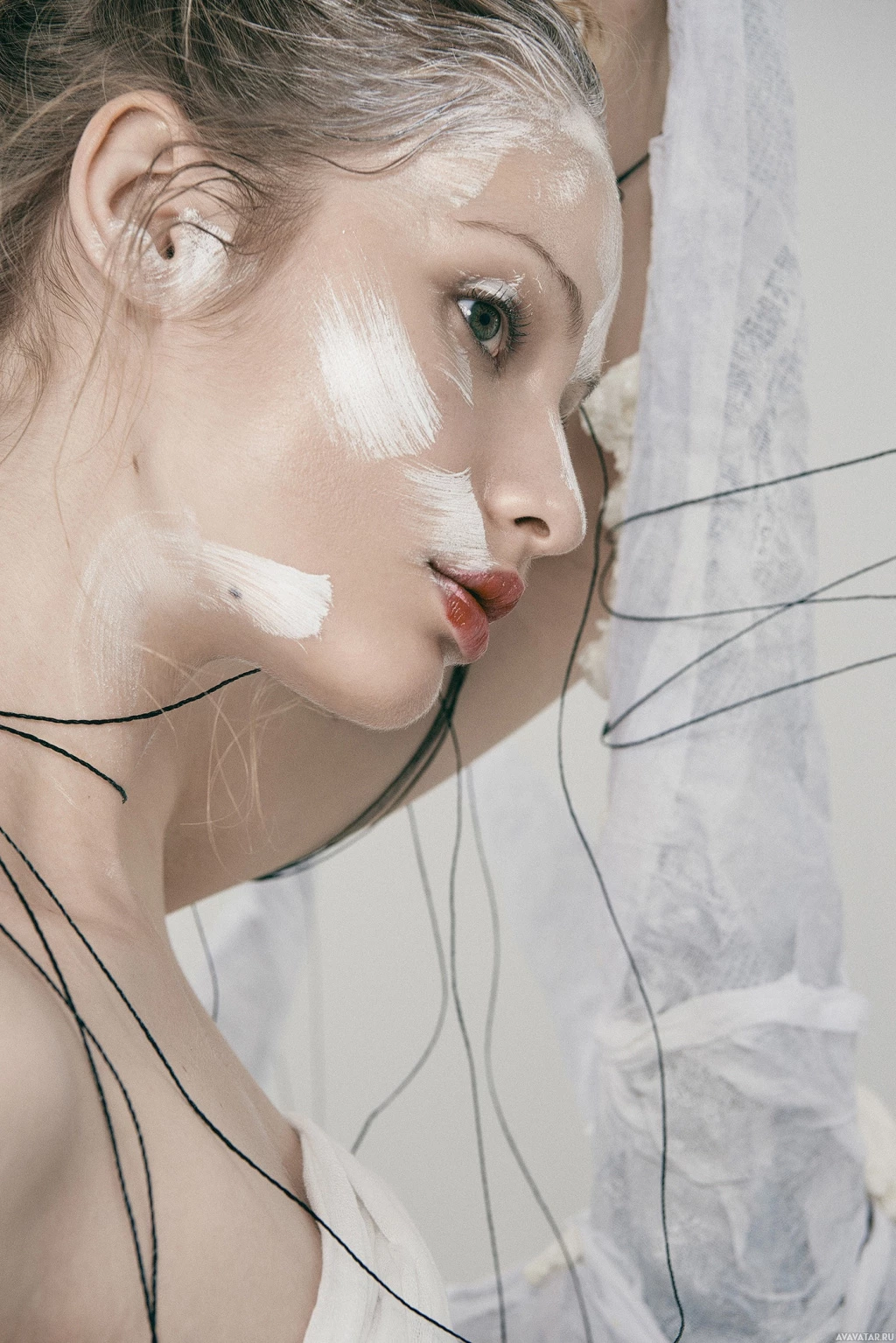 На картинке изображена молодая женщина с художественным макияжем на лице и шее. Кажется, что она смотрит в сторону от камеры, на что-то, чего не видно в кадре. Черты ее лица подчеркнуты белым или бледноватым макияжем, нанесенным с особой тщательностью. Фон нейтральный, что делает акцент на ней. Есть также некоторые текстурированные материалы, которые можно интерпретировать как ткань или форму художественного оформления.