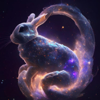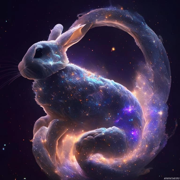 The image shows a whimsical and fantastical depiction of an animal, which is identified as a rabbit. The rabbit appears to be floating in