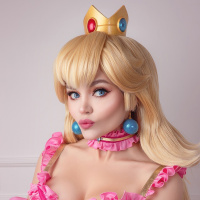 Princess Peach from the Super Mario franchise. They are wearing a pink and white dress with a bow on the back, similar to Princess Peach's iconic outfit, along with a tiara that complements her appearance as a character from