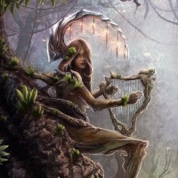 a fantasy scene featuring an ethereal, humanoid creature with long hair and pointed ears. This creature appears to be a fairy or perhaps a type of sprite or elemental being, given its slender build and the presence of a small instrument it's holding that might be some sort of
