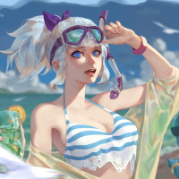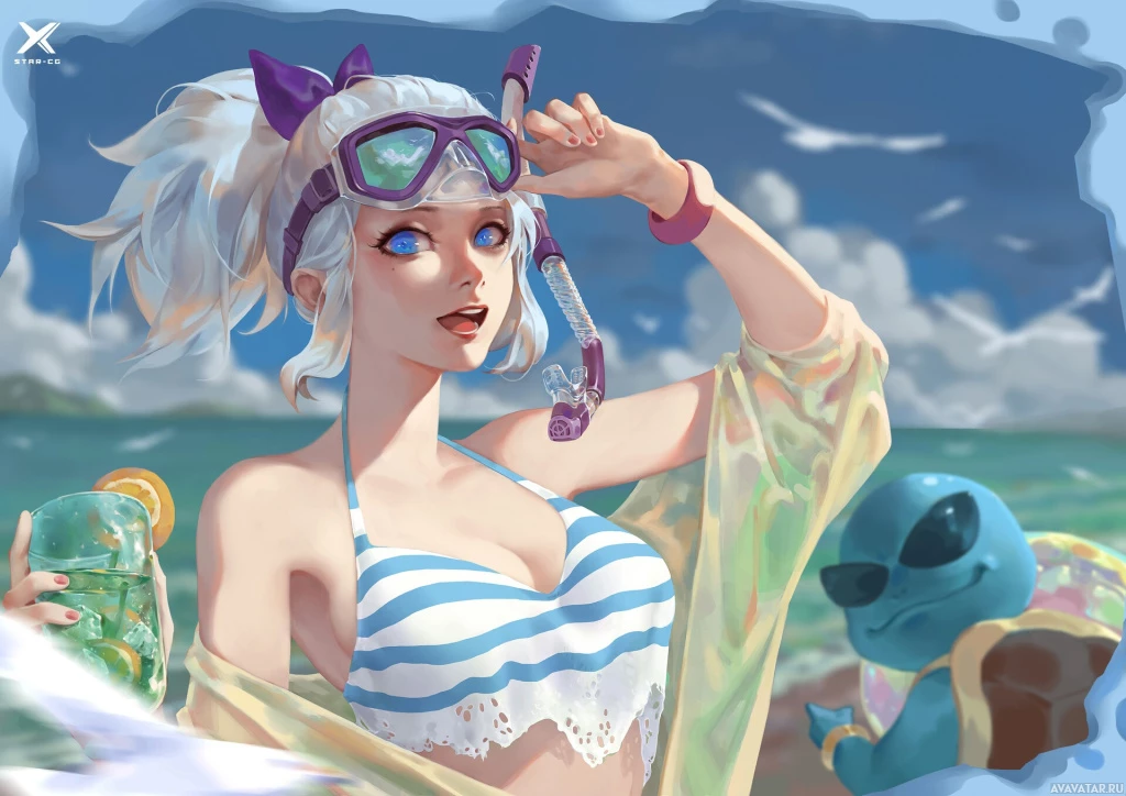 white hair. She is wearing a bikini and sunglasses, with water splashing around her. In the background, there's a small blue creature that resembles a Pokémon, which could suggest this scene takes place in a setting related to the Pokémon series or an animated