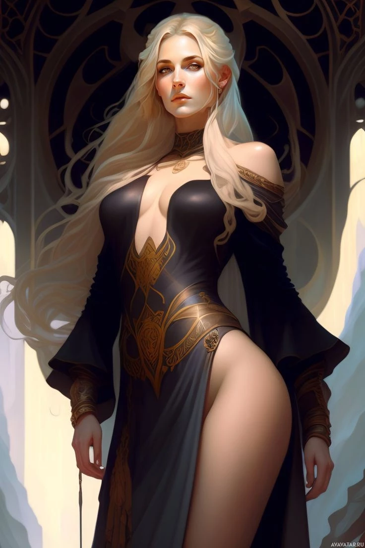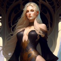 white hair and is wearing an intricate black armor with gold accents. The character's pose suggests she might be a warrior or someone of importance within her