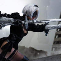 the video game "Nier: Automata." She is depicted in action, wearing a black and white outfit with feather-like elements on her shoulder and chest. She has a mask covering her face, and she is wielding two swords crossed over her body. The setting appears to be