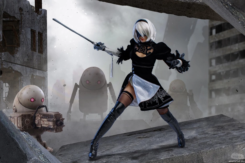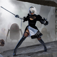 the video game "Nier: Automata." The character appears to be dressed in an outfit that resembles a maid's uniform and is holding what looks like a sword. The background suggests a chaotic or war-like setting with