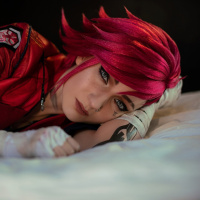 the video game "League of Legends." They are posed as if they were asleep, with their head resting on a pillow. The costume includes