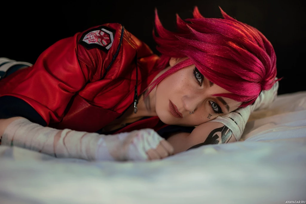 The image shows a person dressed in a cosplay costume of Vi from