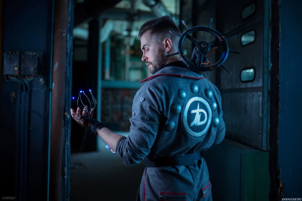 the video game "Atomic Heart." This individual is dressed in a futuristic or retro-
