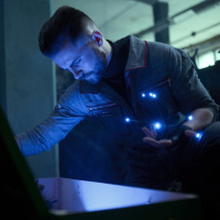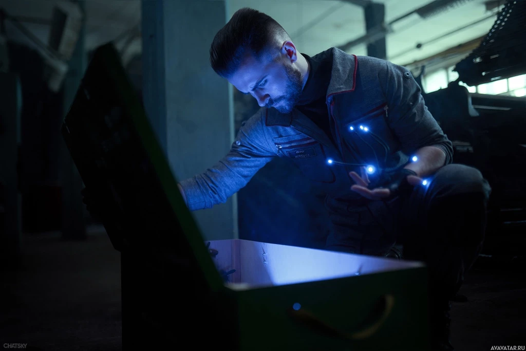glowing components on it, suggesting they may be involved in something technical or specialized. There's also a box open, which could contain parts or tools related to their task. The image does not provide enough context to determine what specific activity the person is engaged in or whether it relates to cosplay or an actual