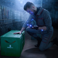 electronic equipment, given the presence of what looks like green boxes with visible wiring and connectors. The setting seems industrial, and there is a dramatic