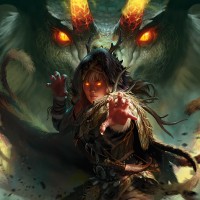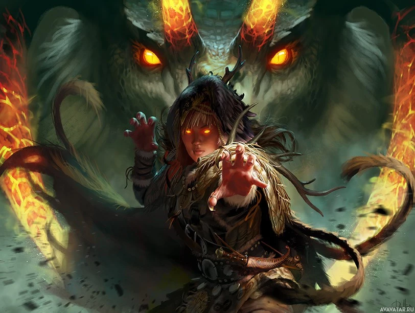 glowing eyes and scales, giving off a sense of menace. The overall atmosphere of the image suggests a magical or mystical setting, likely from a fantasy-themed work such as a book, game, or movie.