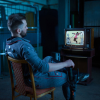 a video game called "Atomic Heart," indicating that he might be playing the game or watching a related video. The scene evokes a sense of solitude and immersion into