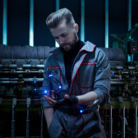futuristic design with a high-tech look. He appears to be in a setting that looks like a laboratory or workshop, possibly part of the game's environment. The man has facial hair and is holding what looks like a device with blue lights on it, suggesting he might be interacting with technology or equipment related to his character's role within the context of