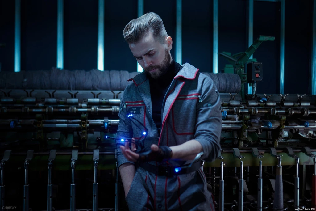 The image shows a man dressed in an Atomic Heart cosplay outfit, which is characterized by its