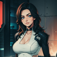 The image depicts an animated character who appears to be Miranda from the "Mass Effect" video game series. She is shown in a science fiction setting, possibly on a spaceship or a command center, with a futuristic design.