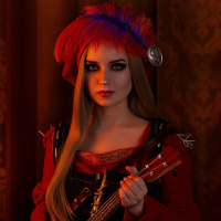 puffy sleeves and pants with embellishments that suggest a medieval or fantasy theme. In her hands, she holds an instrument that appears to be a lute or guitar, which complements the overall