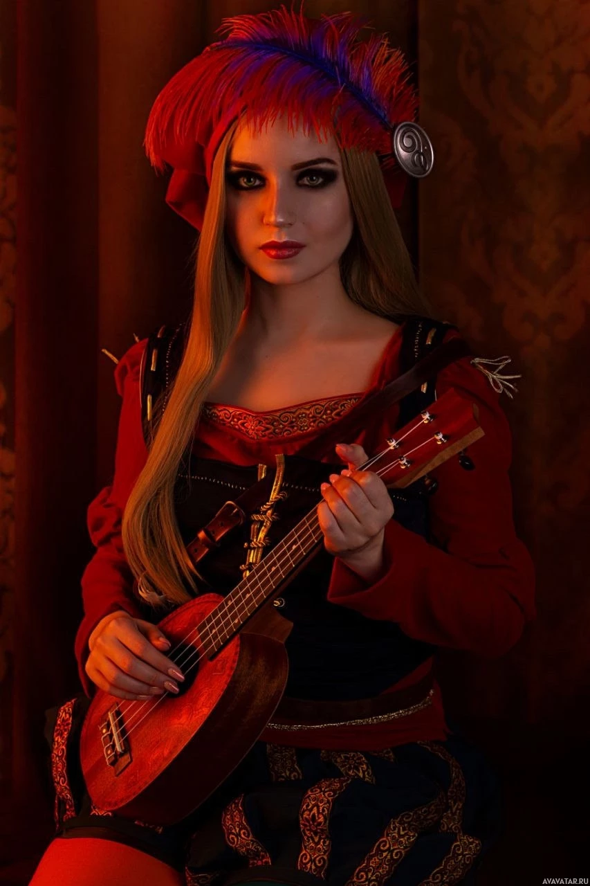 elaborate costume, reminiscent of characters from the "The Witcher" game or cosplay. She is wearing a headdress with red feathers and a bodice that has