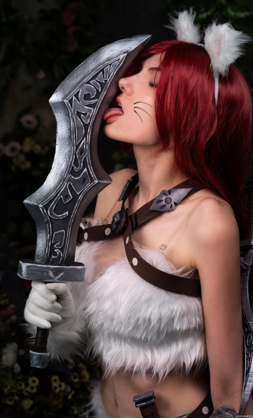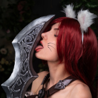 an intricate design on it, which aligns with Katarina's weapon in the game. The person's eyes are closed as they hold the blade near their lips, possibly indicating a playful or seductive pose that might be associated with the character's portrayal.