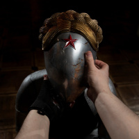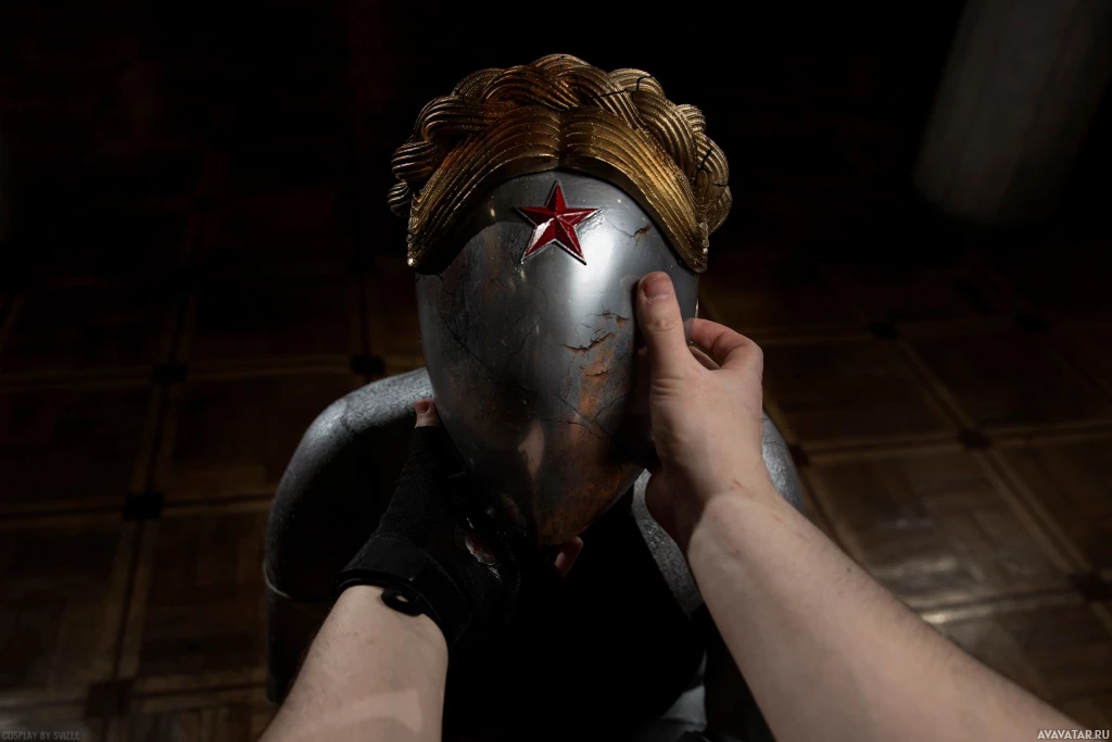 comic books and films. They are wearing a metallic mask, helmet, and armor with