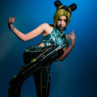 intricate designs on the chest area and black boots, which complements the overall cosplay costume. The background is plain with