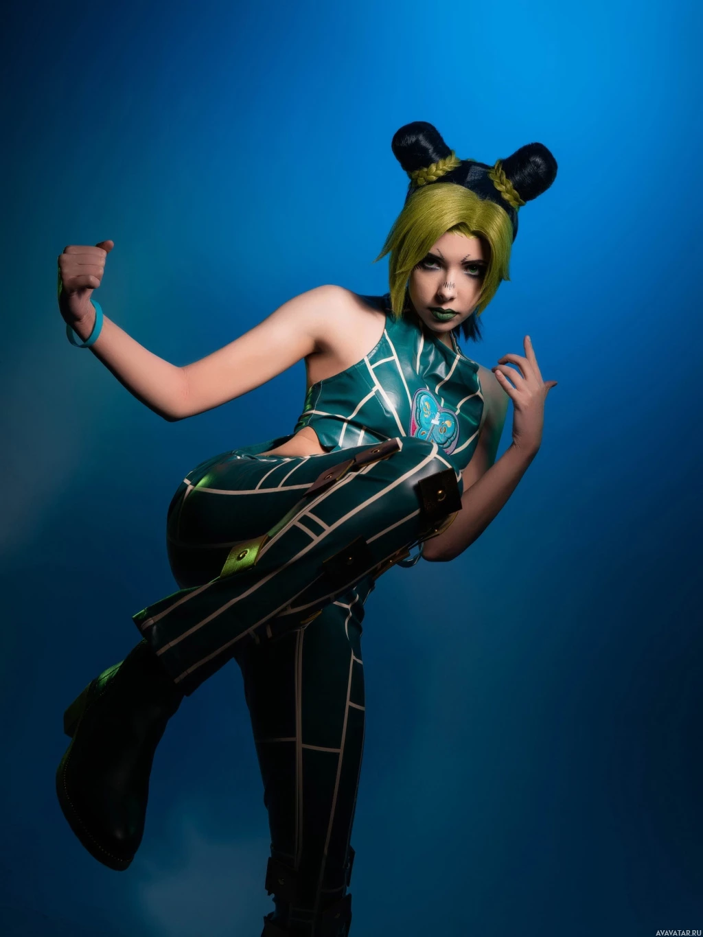 twin tails and wearing makeup that emphasizes this look. They are also wearing a bodysuit with