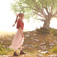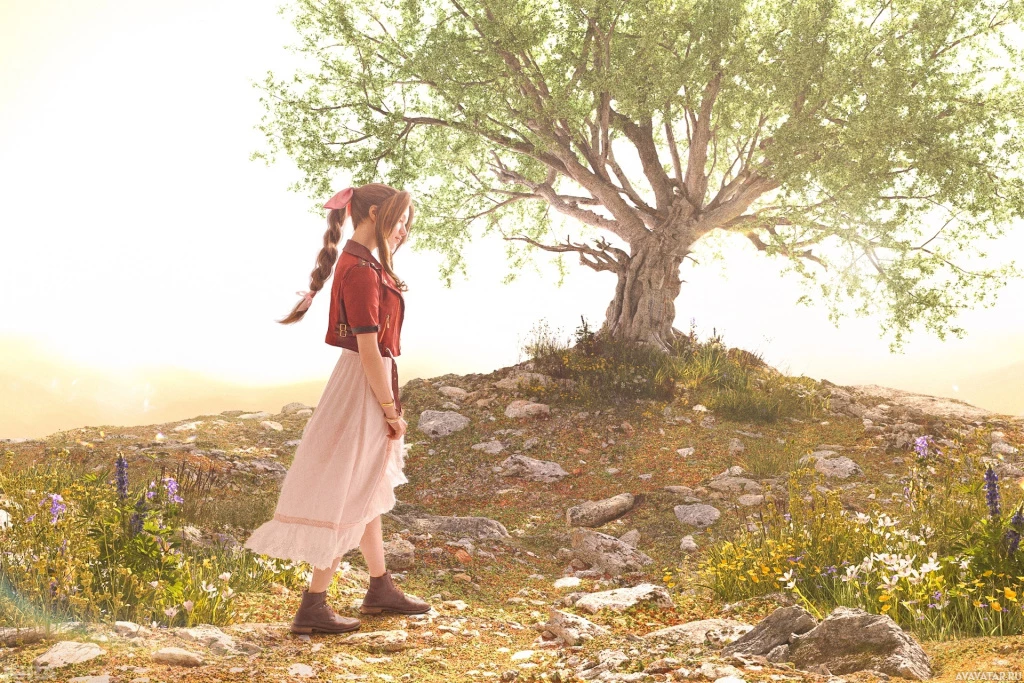 a young girl standing in a picturesque, natural setting. She appears to be dressed in a traditional or folk-inspired outfit that includes a dress and a petticoat, with her hair styled into braids. In front of her stands a large tree with a sturdy trunk and