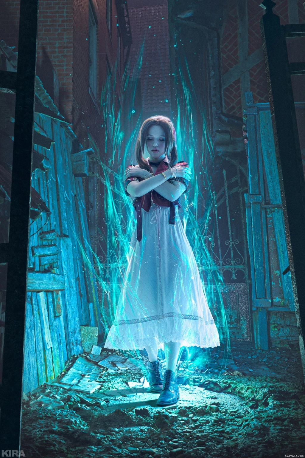 the video game "Silent Hill." The individual is wearing a dress and has their eyes closed. The setting appears to be in ruins, which aligns with the dark and