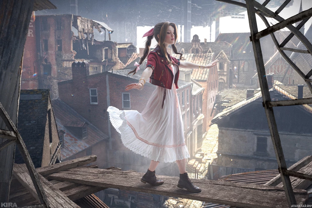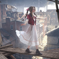 a female character standing on what appears to be a rooftop in an urban setting that looks damaged and possibly post-apocalyptic. She is wearing a dress with