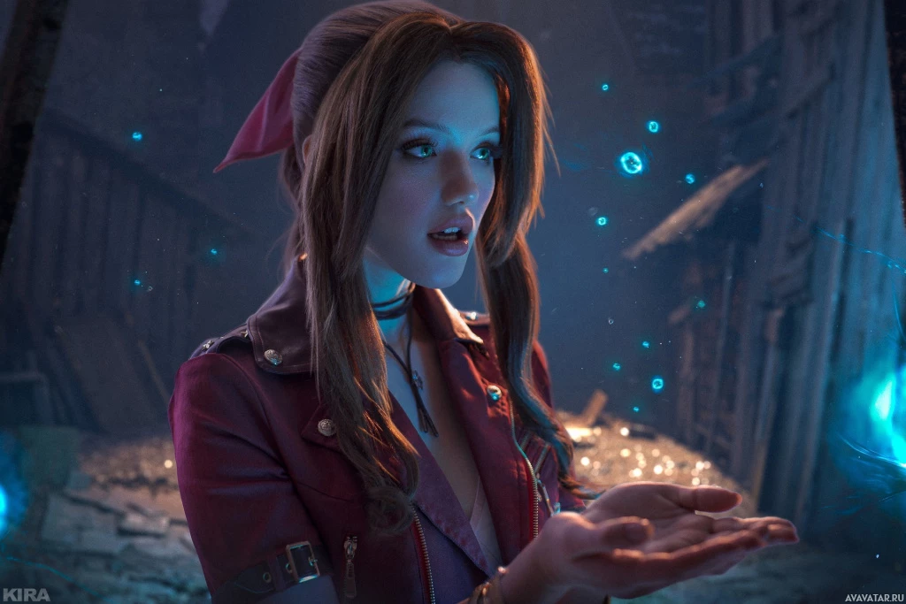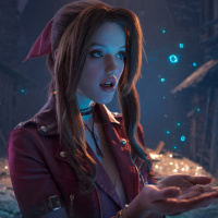 brown hair and is wearing a red coat with gold details, which suggests she may have a role associated with magic or combat. The character is also holding out her hand as if casting a spell or summoning something. In the background, there are magical elements like sparks and what looks like a portal or vortex of energy, further hinting at a fantastical or supernatural theme in this image.