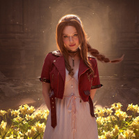 a video game. She is wearing a costume that includes a red leather jacket over