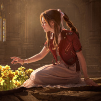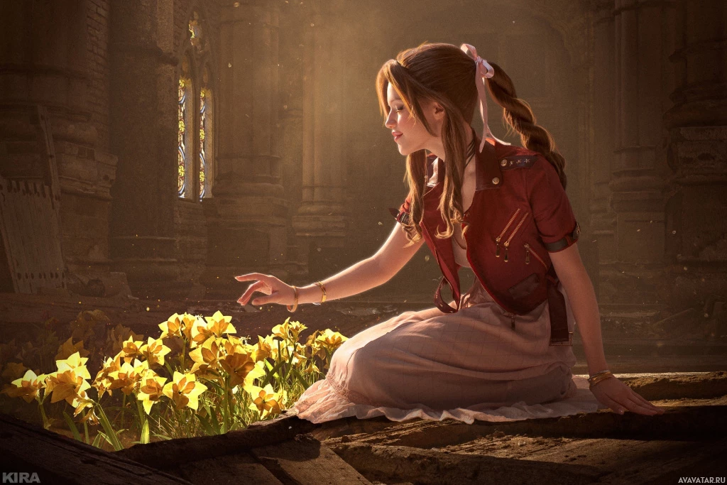 a fantasy setting, sitting on the ground with her hands clasped together. She appears to be surrounded by nature, possibly in a garden or woodland area. There are