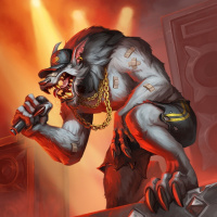 The image features a fantasy creature that resembles a werewolf, standing on what appears to be a stage with a microphone in its paw. The setting has an ambiance of a concert or performance venue, indicated by the lights and stage design. The werewolf is wearing what seems to be a bandana or headband around its neck.