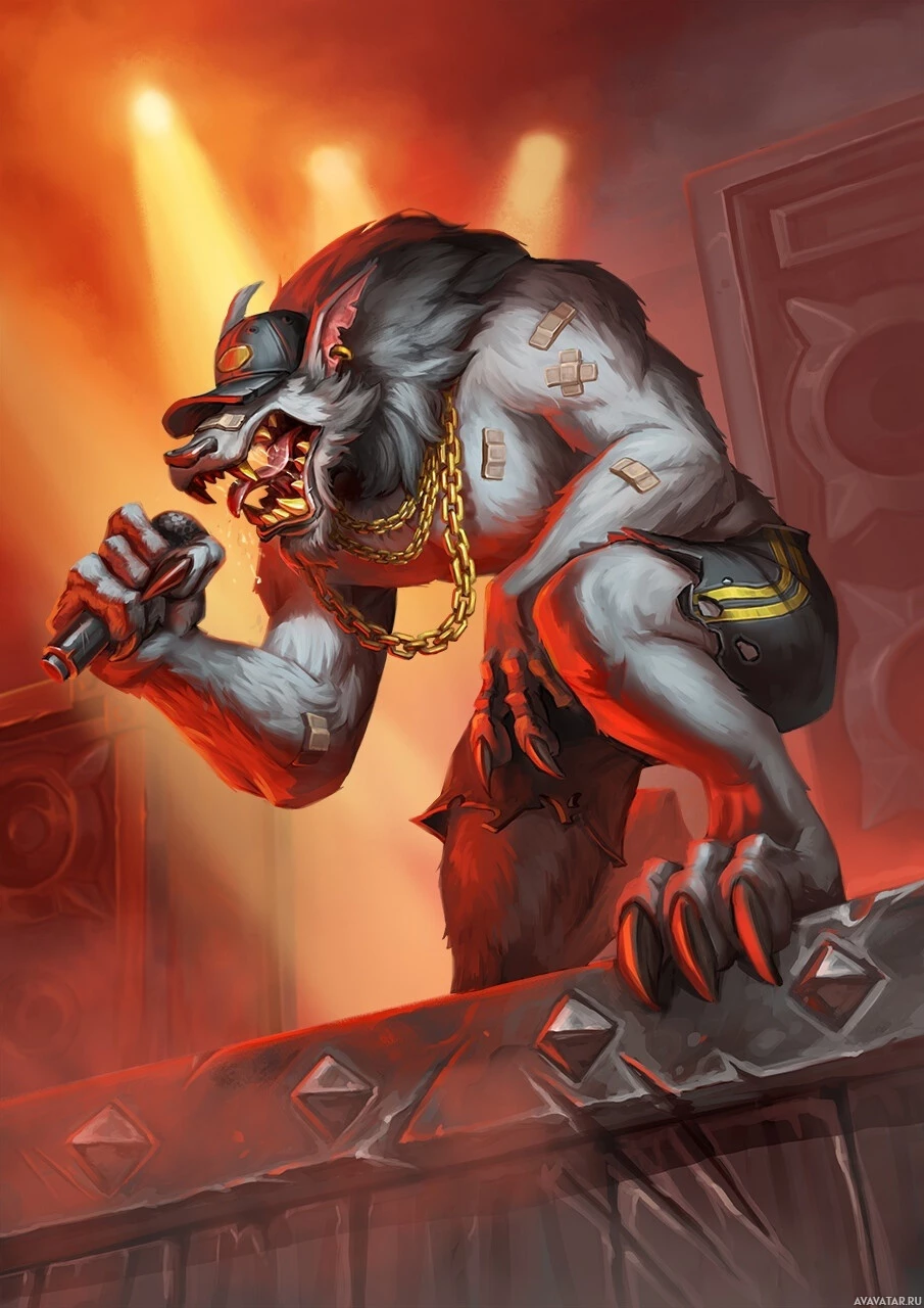 На картинке изображено фантастическое существо, похожее на оборотня, стоящее на сцене с микрофоном в лапе. Обстановка напоминает концертную площадку или представление, о чем свидетельствуют освещение и оформление сцены. На шее у оборотня надето что-то похожее на бандану или повязку на голову.