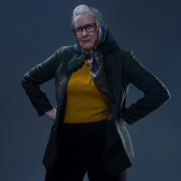The image shows a person dressed as an elderly character from the game "